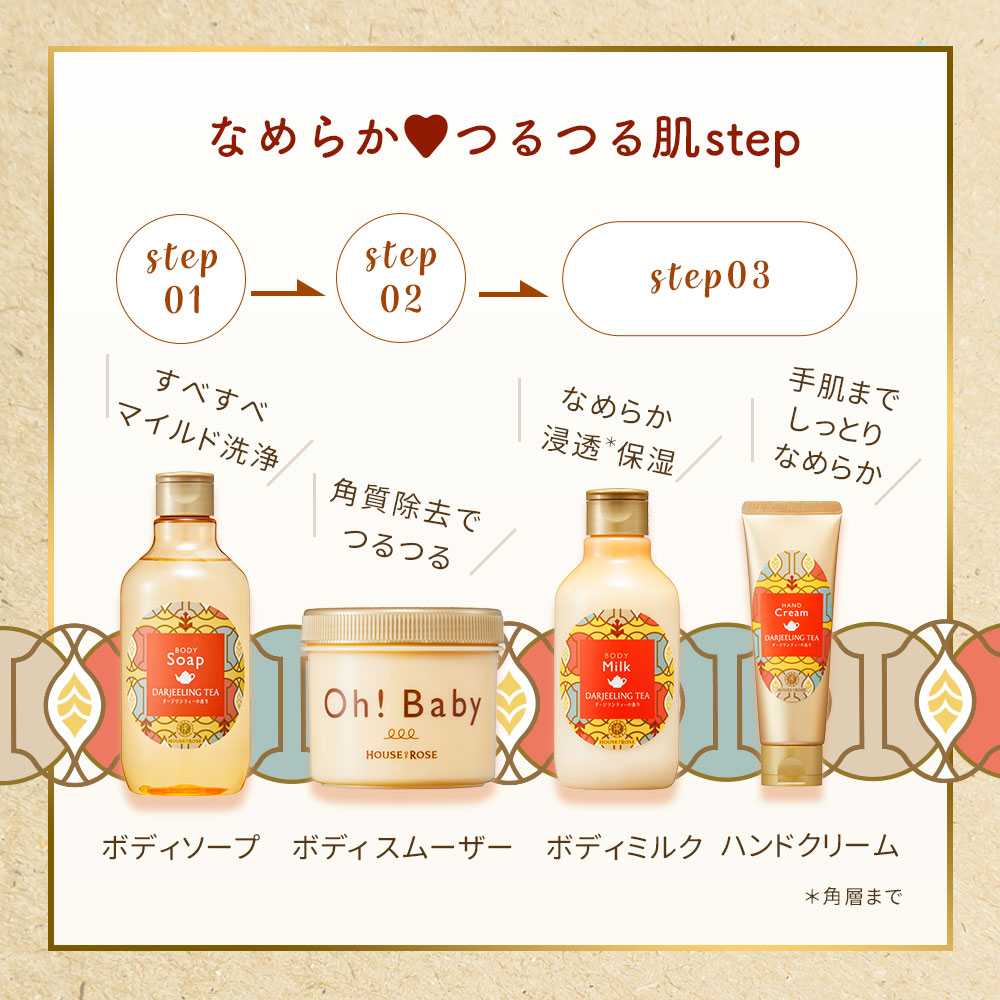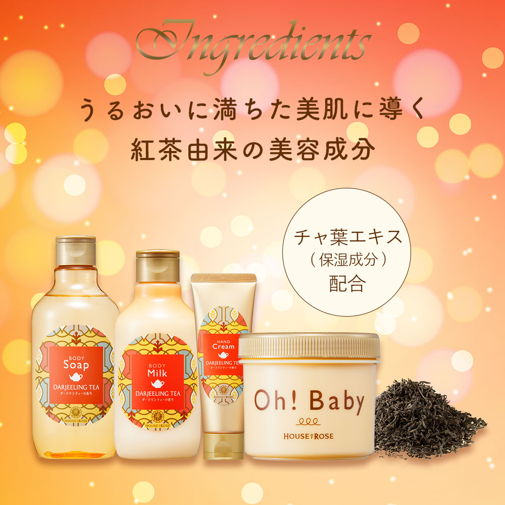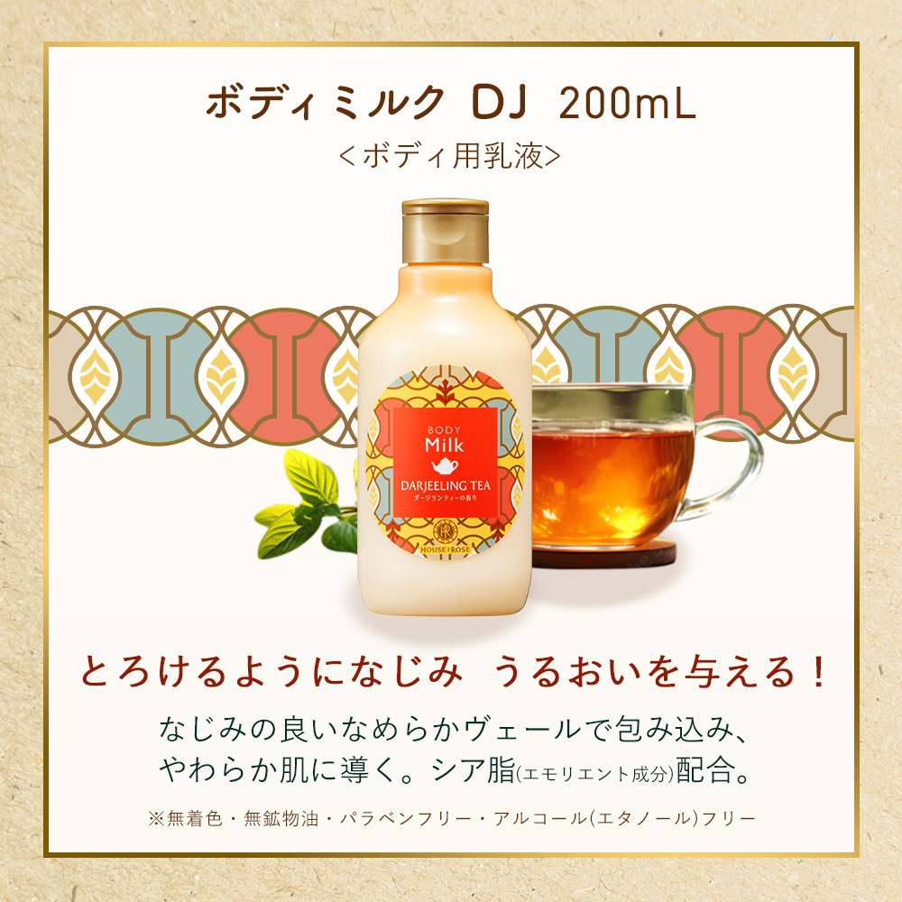 とろけるようになじみ、お肌をうるおいで満たすボディミルクです。 うるおいに満ちた美肌に導く、紅茶由来の美容成分、チャ葉エキス(保湿成分)配合。 うるおいを閉じ込め、乾燥からお肌を守り、やわらかくなめらかなお肌に導きます。上質で芳醇な温かみのあるダージリンティーの香り。