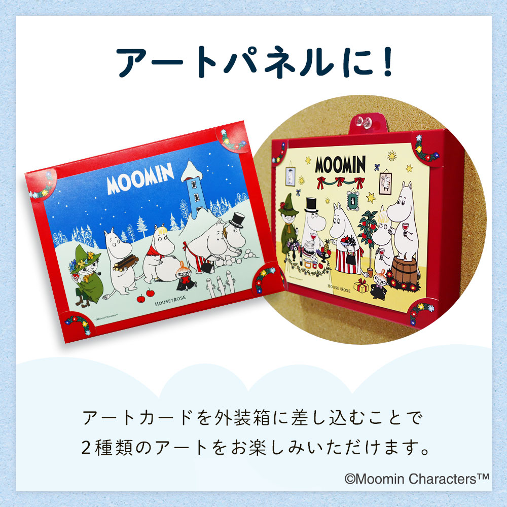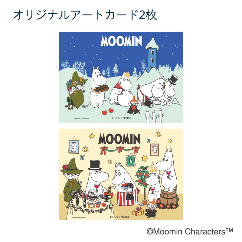 ホリデーシーズンをたのしむムーミンと仲間たちのかわいいイラストが描かれたアートカードです。