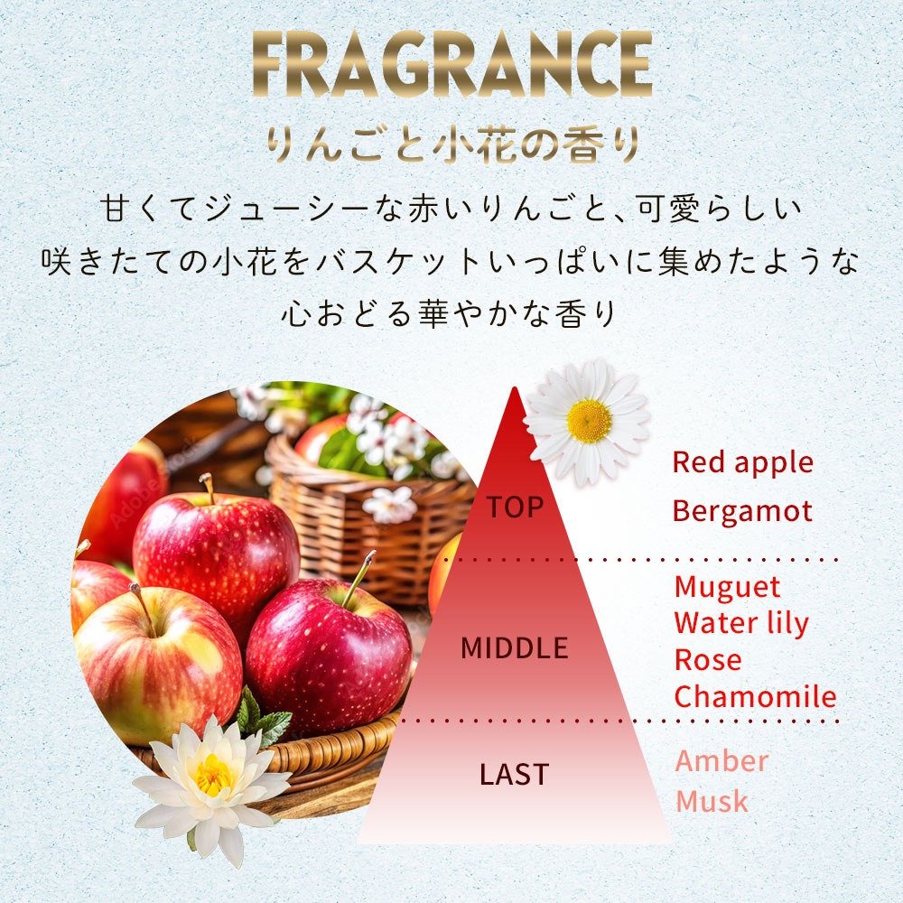:甘くてジューシーな赤いリンゴと可愛らしい咲きたての小花をバスケットいっぱいに集めたような、心おどる華やかな香り。