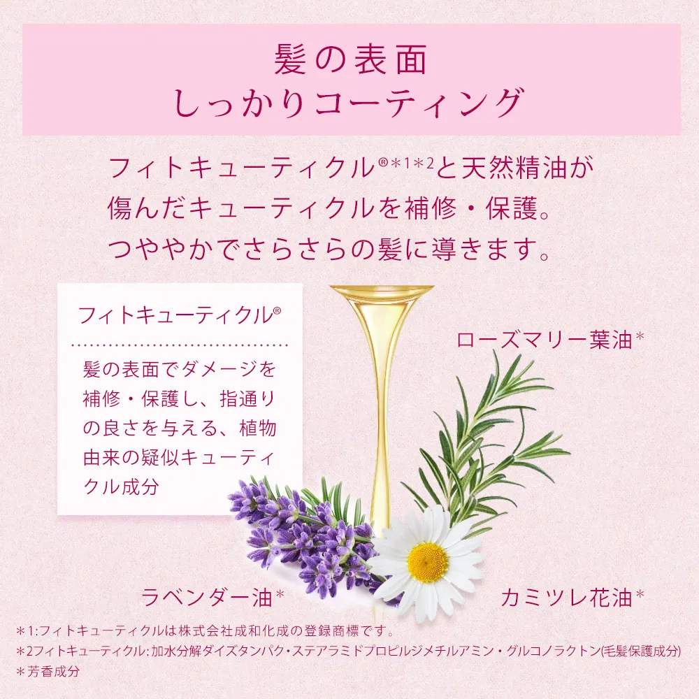 〇適量(ミディアムヘアで2プッシュ程度)を手のひらにとり、毛先を中心に髪全体によくなじませます。髪の長さやボリュームによって使用量は調節してください。陽光桜花エキス(セラススヨウコウ花エキス)・陽光桜葉エキス(セラススヨウコウ葉エキス)・オオヤマザクラ果実エキス(保湿成分)、5つのハーブエキス(スイカズラ花エキス・トウキンセンカ花エキス・カニナバラ果実エキス・カミツレ花エキス・ブドウ葉エキス)・シルクエキス(加水分解シルク)(すべて毛髪保護成分)、フィトキューティクル(加水分解ダイズタンパク・ステアラミドプロピルジメチルアミン・グルコノラクトン)(毛髪補修成分)、天然精油(カミツレ花油・ラベンダー油・ローズマリー葉油)(芳香成分)シクロペンタシロキサン、ジメチコン、ホホバ種子油、ペンチレングリコール、セラススヨウコウ花エキス、セラススヨウコウ葉エキス、オオヤマザクラ果実エキス、スイカズラ花エキス、トウキンセンカ花エキス、カニナバラ果実エキス、カミツレ花エキス、ブドウ葉エキス、加水分解シルク、カミツレ花油、ラベンダー油、ローズマリー葉油、加水分解ダイズタンパク、グルコノラクトン、ステアラミドプロピルジメチルアミン、イソステアリン酸、水、BG、エタノール、香料