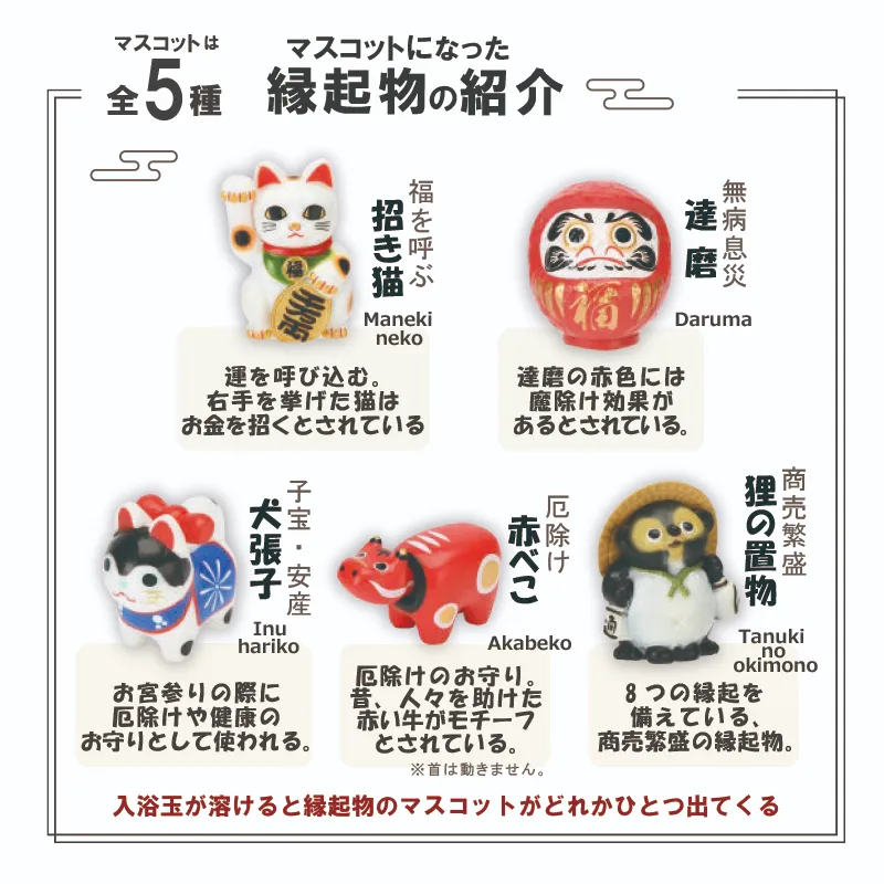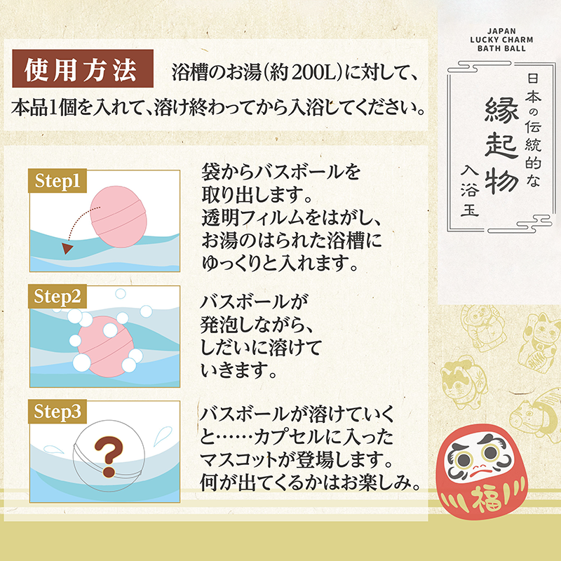 毎日のバスタイムが楽しくなる、発泡タイプのマスコット入り入浴料です。 バスボールが溶けると、リアルな日本の伝統的な縁起物のマスコットが出てきます。 マスコットは全部で5種類。何が出てくるかはお楽しみです。 小さいお子様から大人まで楽しめて、年末年始のちょっとしたギフトなどにもおすすめです。 爽やかかつ華やかなさくらの香り。