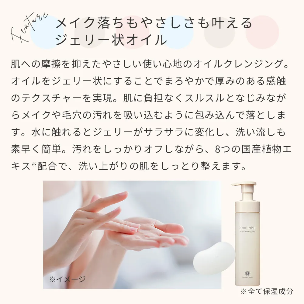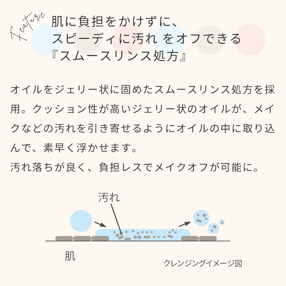 お肌への摩擦を抑えた、やさしい使い心地のオイルクレンジングです。 オイルをジェリー状にしたまろやかな厚みのある感触で、お肌に負担なくスルスルとなじみながらメイクや毛穴の汚れを包み込んで落とします。 水に触れると、ジェリーがサラサラに変化。素早く汚れオフ&洗い流しができるスムースリンス処方です。 8つの国産植物エキス(*3)を配合。必要なうるおいを残して、洗い上がりのお肌をしっとり整えます。 まつ毛エクステにも使用できます(*4)。