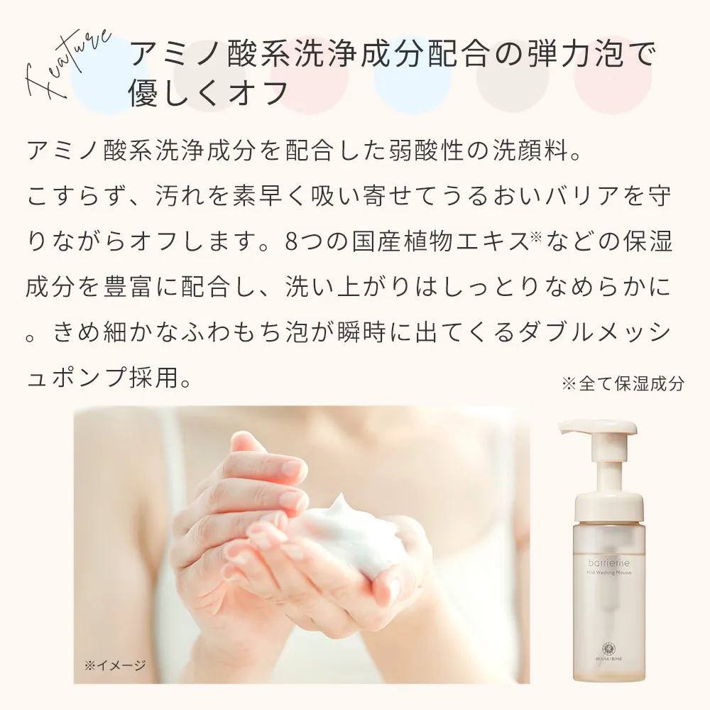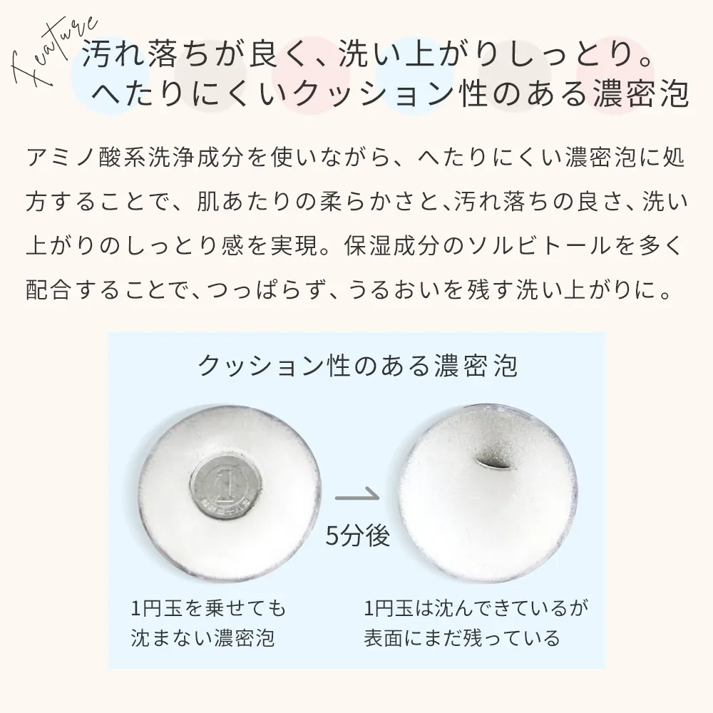 キメ細かいふわふわの泡で汚れをオフする、泡立て不要の弱酸性ムース状洗顔料です。 うるおいを守りながら洗うアミノ酸系洗浄成分を配合し、クッション性の高い濃密泡に処方することで、肌あたりの柔らかさと汚れ落ちの良さ、洗いあがりのしっとり感を実現しました。 8つの国産植物エキス(*3)やソルビトール(保湿成分)を配合し、うるおいを守りながらなめらかに洗い上げます。