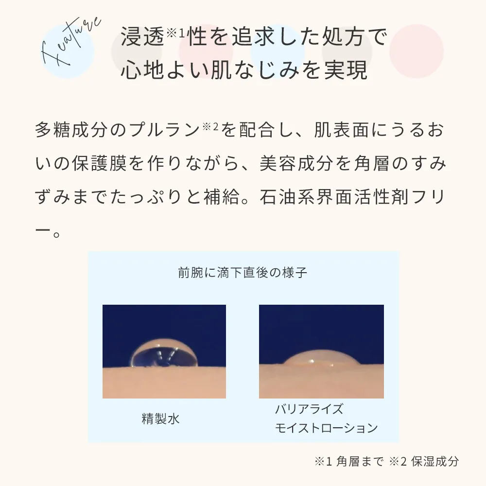 肌本来のバリア機能をサポートする、浸透(*3)性にこだわった保湿化粧水です。 肌表面にうるおいの保護膜を作りながら、美容成分を角層のすみずみまでたっぷりと補給します。 パシャッとみずみずしくお肌になじむとろみ感のあるテクスチャーは、季節や肌タイプを選ばない心地よい使用感です。 8つの国産植物エキス(*4)やワイルドタイムエキス(保湿成分)を配合。乾燥しがちなお肌のうるおいを底上げし、透明感あふれるゆらぎにくいお肌へ導きます。