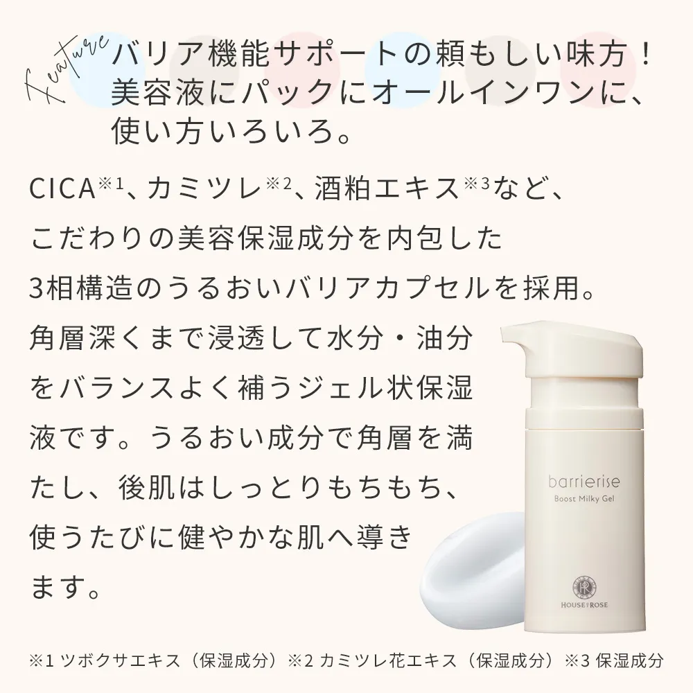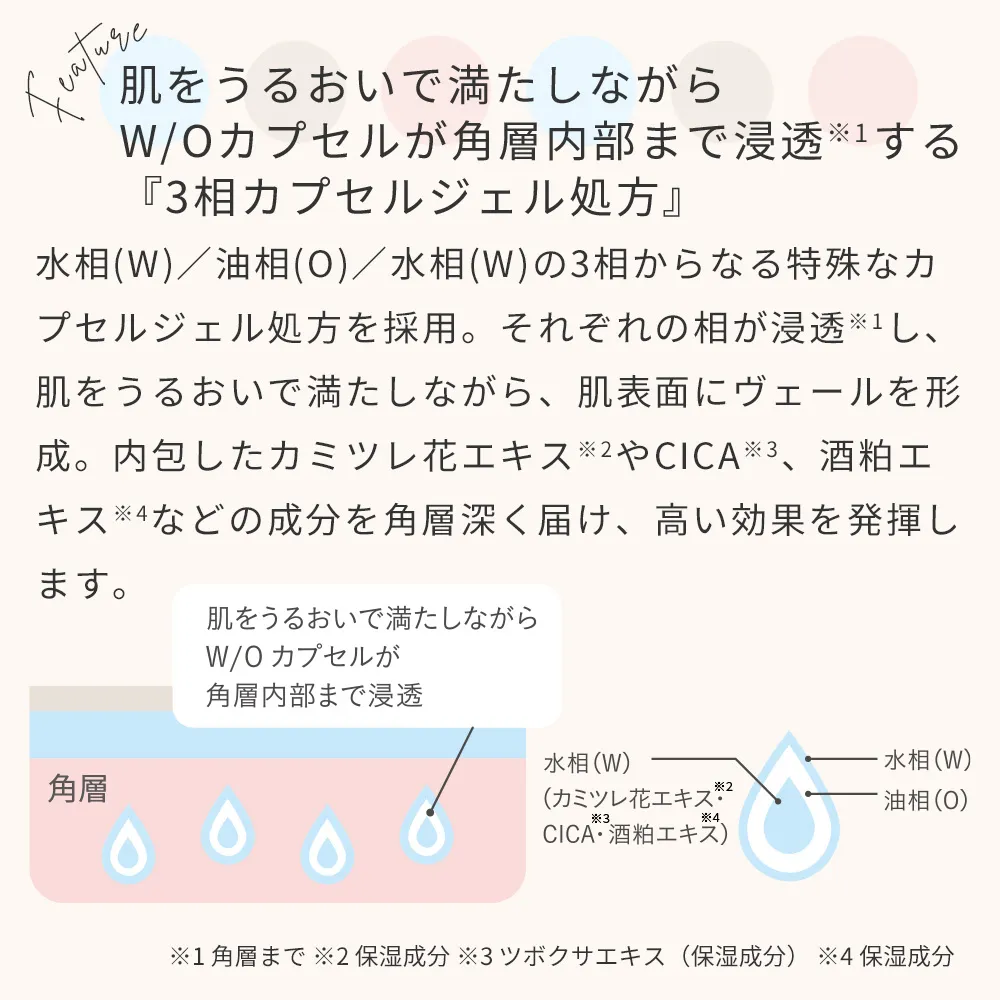 美容液として、パックとして、オールインワンとして、肌コンディションに合わせてマルチに使用できるジェル状保湿液です。 CICA(*3)、カミツレ花エキス(*4)、酒粕エキス(*4)などこだわりの美容成分を包み込んだ3相構造のうるおいバリアカプセルが角層深くまで浸透して、水分・油分をバランスよく補います。 みずみずしくべたつかないテクスチャーは、なめらかになじみ肌表面をつるつるに。8つの国産植物エキス(*5)配合で、外的環境(*6)からお肌を守り、しっとりとしたゆらぎにくいお肌へ導きます。