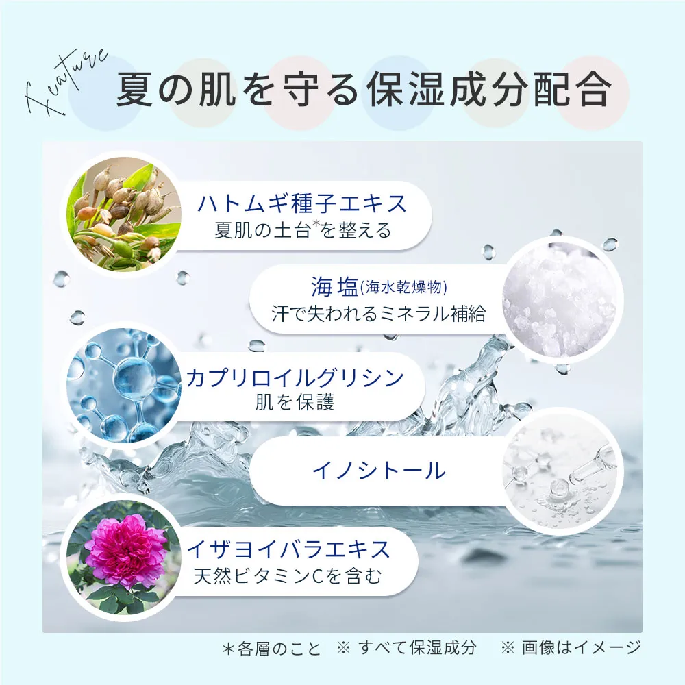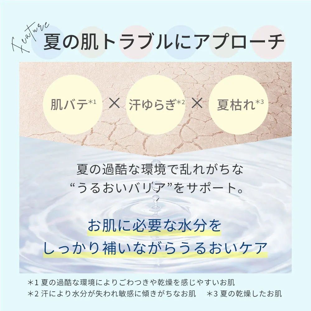 汗と共に失われがちなうるおいを補給しながら、肌本来のバリア機能をサポートする浸透(*2)性にこだわった保湿化粧水です。 肌バテ(*3)、汗ゆらぎ(*4)、夏枯れ(*5)など、夏のうるおいバリアの乱れに着目! 角層すみずみまでうるおって夏の乾きにやさしく寄り添い、透明感あふれるゆらぎにくいお肌へ導きます。8つの国産植物エキス(*6)配合。