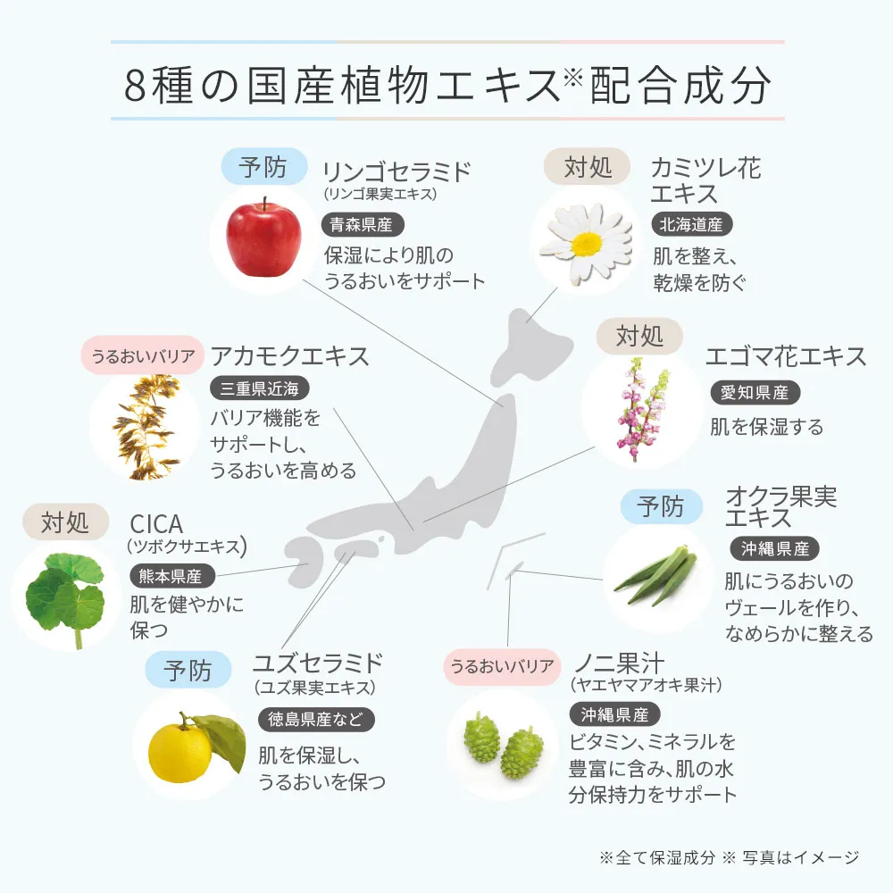 カミツレ花エキス・CICA(ツボクサエキス)・紫蘇花穂エキス(エゴマ花エキス)・オクラ果実エキス・リンゴ果実エキス・ユズ果実エキス・ノニ果汁(ヤエヤマアオキ果汁)・アカモクエキス・イザヨイバラエキス・ハトムギ種子エキス・海水乾燥物(海塩)・アミノ酸誘導体(カプリロイルグリシン)・イノシトール・ラフィノース(すべて保湿成分)