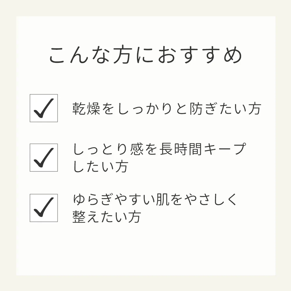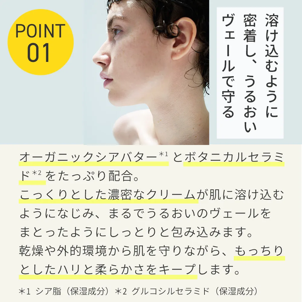 化粧水、美容液のお手入れ後、スパチュラに適量(朝:パール1 粒位、夜:パール2粒位)を取り、顔全体にやさしくなじませます。オーガニックシアバター(シア脂)・ボタニカルセラミド(グルコシルセラミド)・ピンクロックローズエキス(ムラサキゴジアオイ花/ 葉/ 茎エキス)・ナノカカオ(カカオエキス)(すべて保湿成分)水、プロパンジオール、グリセリン、シア脂、オクチルドデカノール、ラウリン酸ヘキシル、トリ(カプリル酸/カプリン酸)グリセリル、オリーブ果実油、ステアリン酸ポリグリセリル-2、セテアリルアルコール、水添レシチン、ステアリン酸グリセリル、ペンチレングリコール、グルコシルセラミド、ムラサキゴジアオイ花/葉/ 茎エキス、カカオエキス、カミツレ花エキス、タチジャコウソウ花/ 葉/ 茎エキス、ローズマリー葉エキス、タンカン果実水、ラベンダー花エキス、ダマスクバラ花水、セージ葉エキス、オレンジ果皮油、ニオイテンジクアオイ油、ハトムギ種子エキス、シイクワシャー果実水、ホホバ種子油、トウキンセンカ花エキス、アルガニアスピノサ核油、ダイズ油、アンズ核油、マカデミア種子油、マカデミアナッツ脂肪酸フィトステリル、セラミドNP、セラミドNG、セラミドAP、コメヌカ水、ブドウ果実水、酒粕エキス、コーンスフィンゴ糖脂質、パイナップル果実エキス、ユズ果実エキス、ステアリルアルコール、ポリグリセ リン-3、ステアリン酸、フィトステロールズ、ジステアリン酸ポリグリセリル-3メチルグルコース、ラフィノース、マルチトール、BG、トコフェロール、α-グルカン、レシチン、ミリスチン酸ポリグリセ リル-10、リゾレシチン、スフィンゴ糖脂質、水添リゾレシチン、アルギニン、フェノキシエタノール